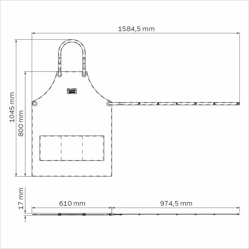 Recommendations for Use: Do not dry clean. Do not bleach. Do not soak. Dry in the shade. Avoid ironing at temperatures above 110 °C (230 °F). Do not iron the synthetic leather parts. Pigmented products can stain the apron. Do not store sharp and piercing items in your pocket. To discard products and packaging, follow existing recycling guidelines.