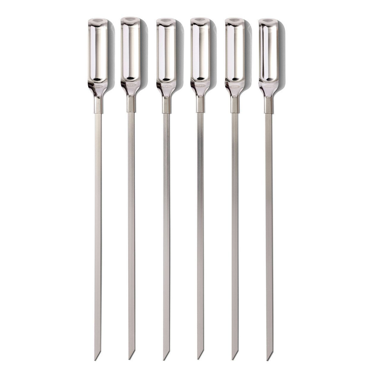 With the OXO Good Grips 6-Piece Grilling Skewers Set, ingredients slide onto the sharp points with ease, and the flat design keeps your kabobs steady as they cook. The Skewers have wide handles for fumble-free flipping with tongs, and a thumb-sized divot that for sliding cooked food onto the plate. The flat design also allows the handles nest together for neat, space-saving storage in the off-season. Dishwasher safe.