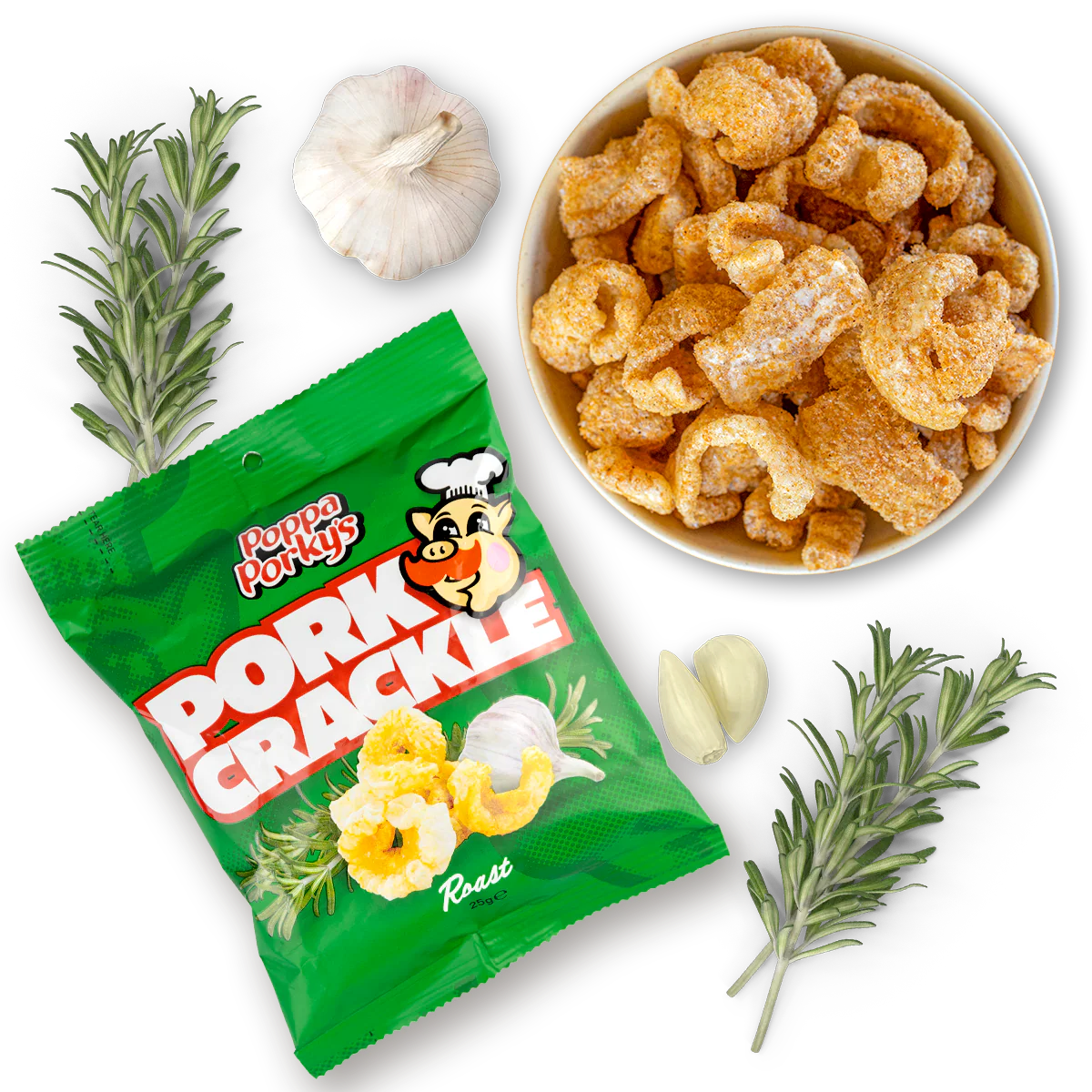 Poppa Porky's Pork Crackle are tasty bite-sized snacks bursting with flavour.